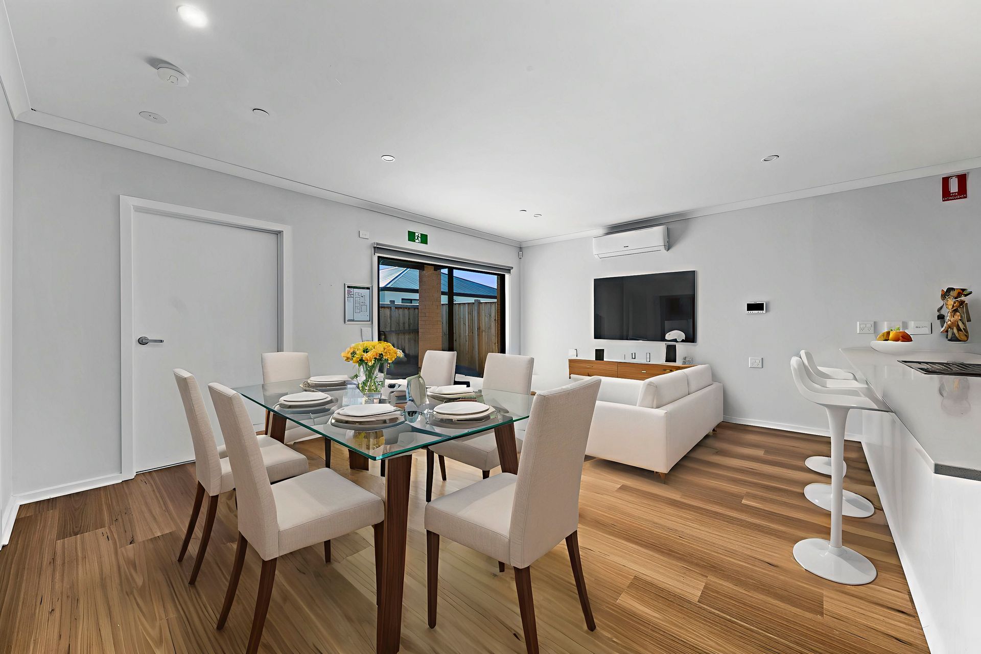 - Large open living and dining area with low-maintenance finishes